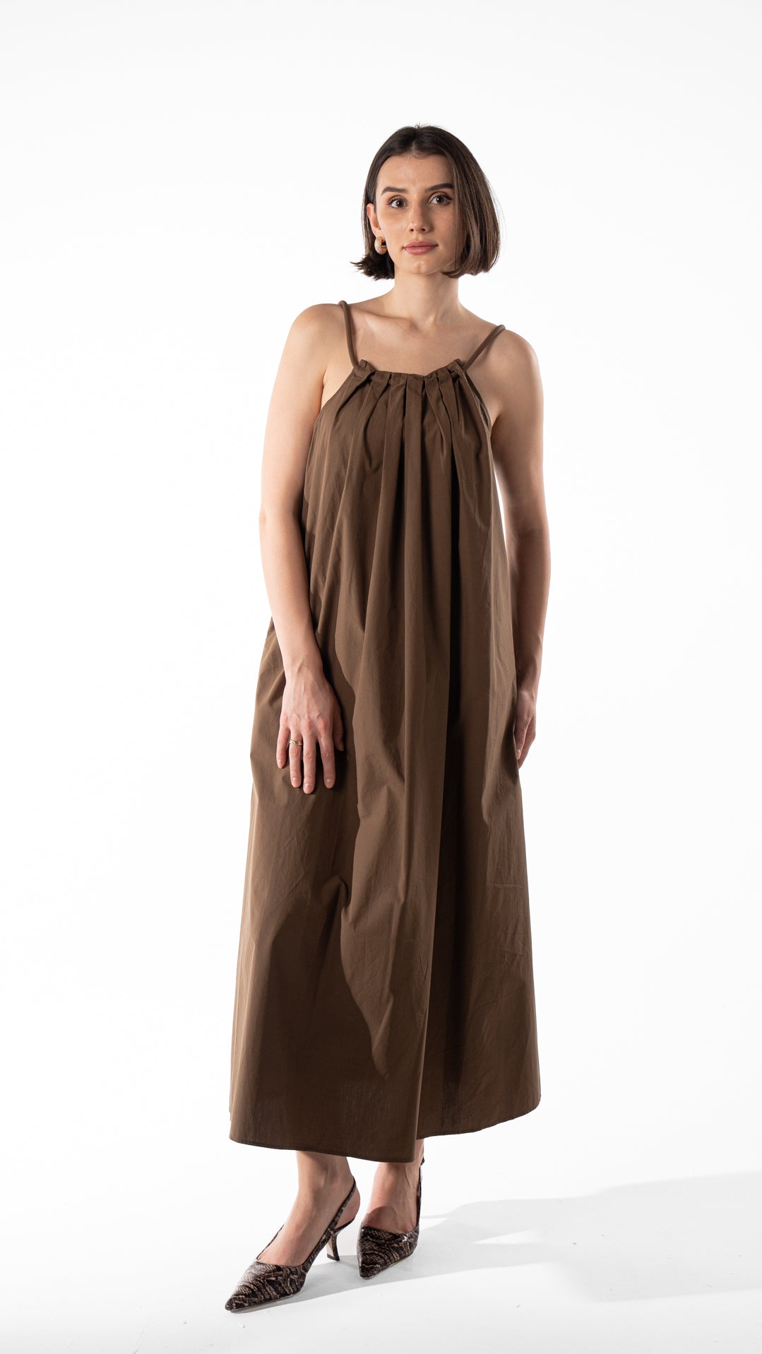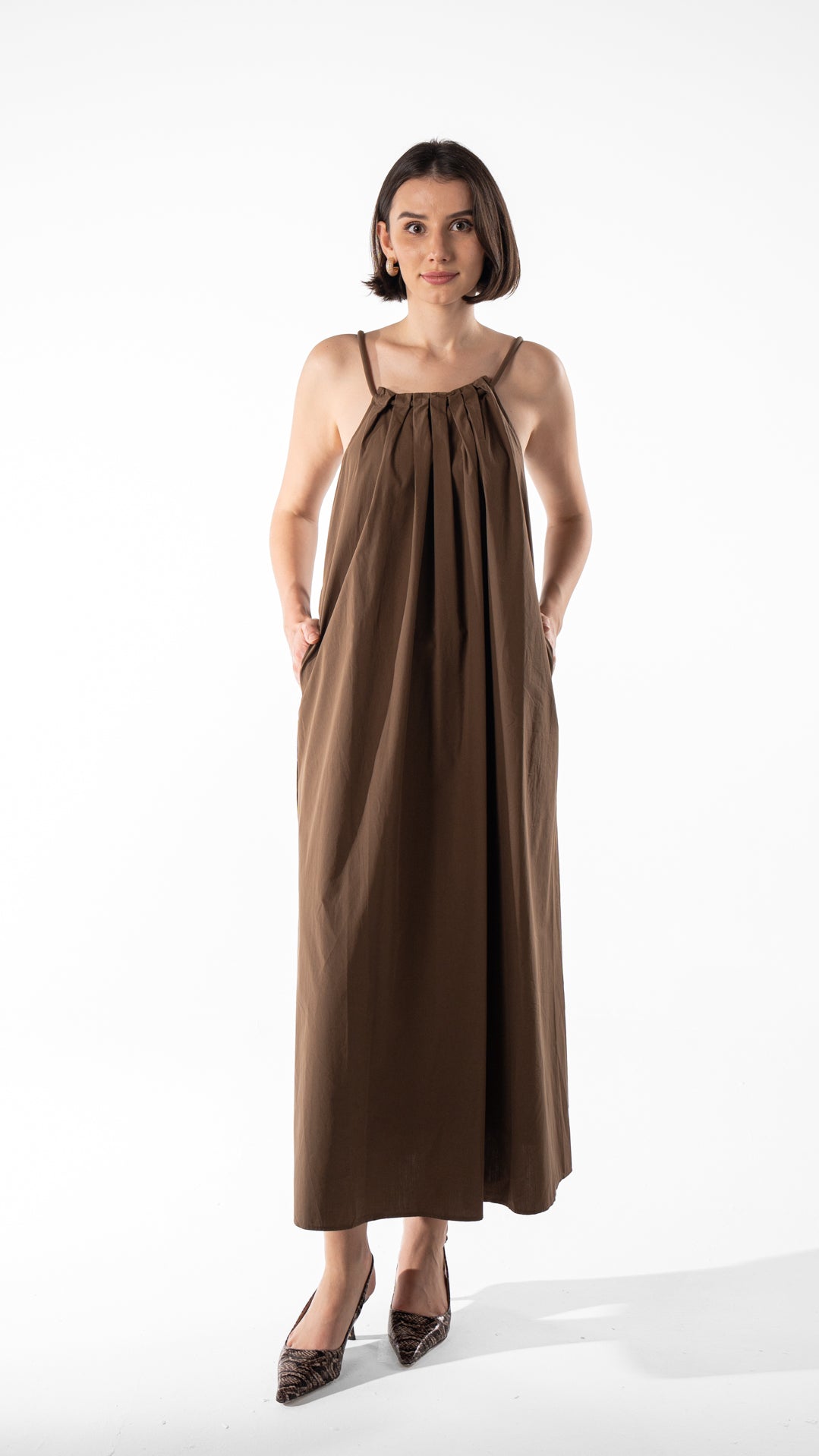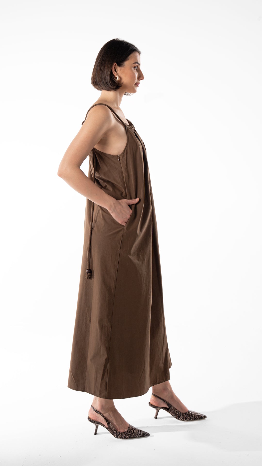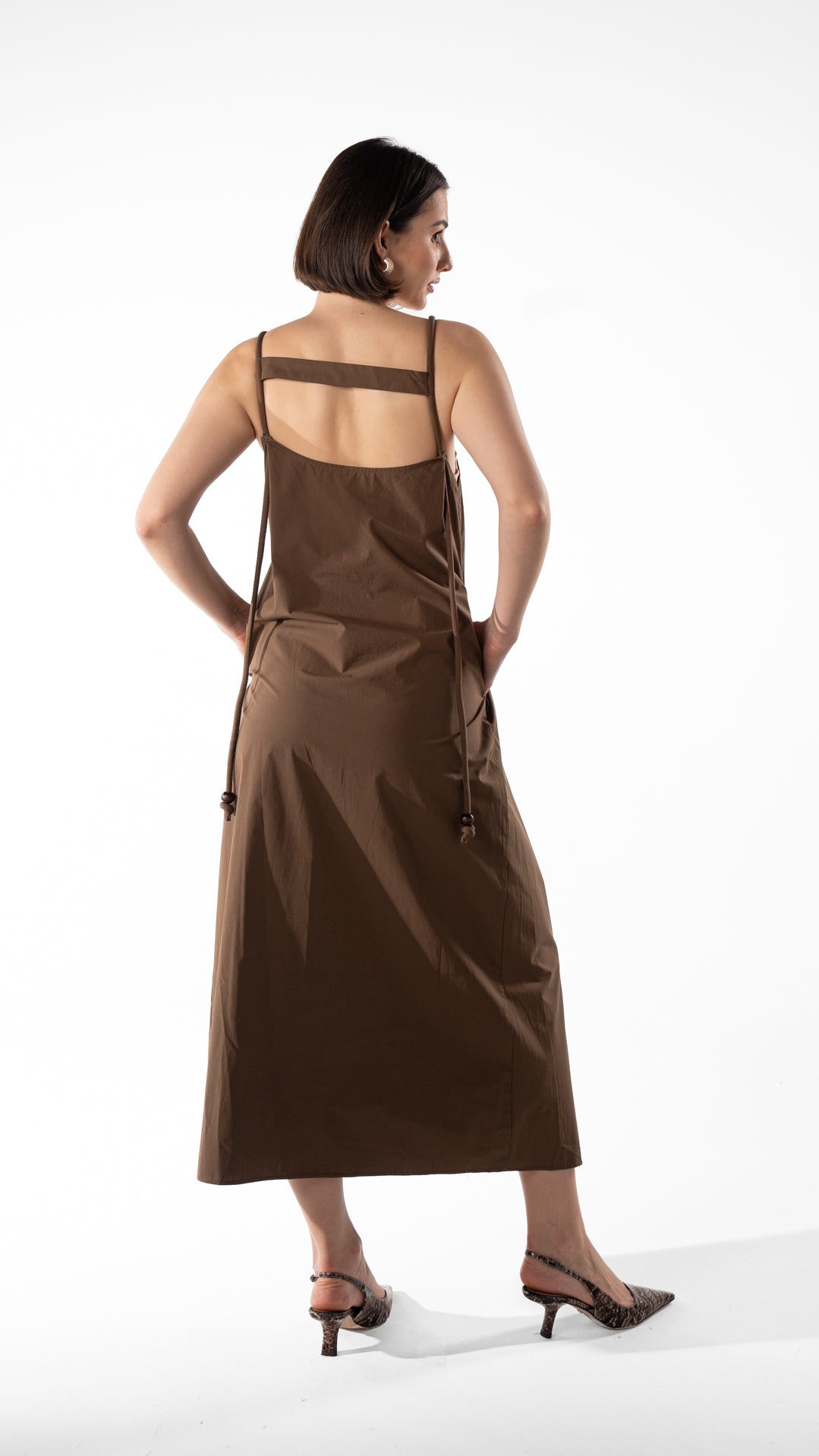 Flowy cotton maxi dress with adjustable straps and wooden bead details. Features a relaxed fit and back strap design. Length 133 cm.