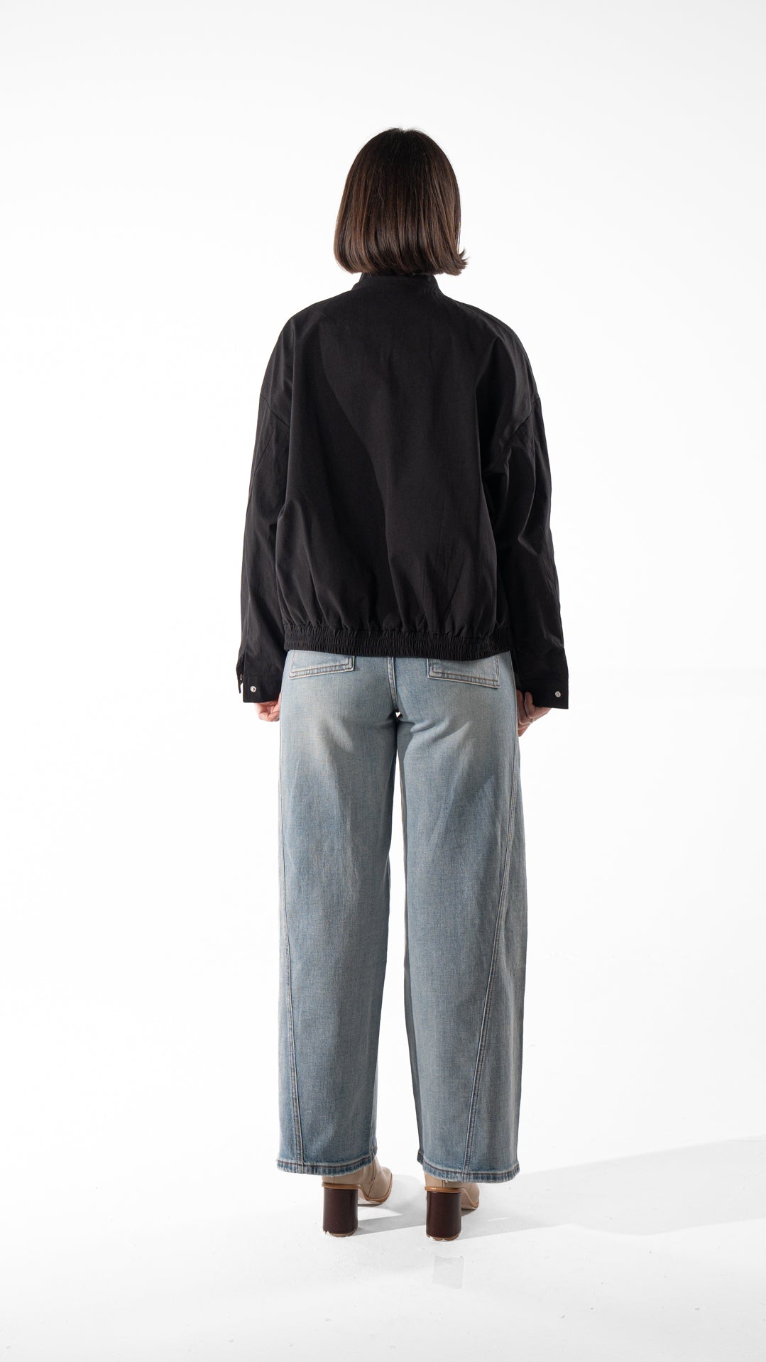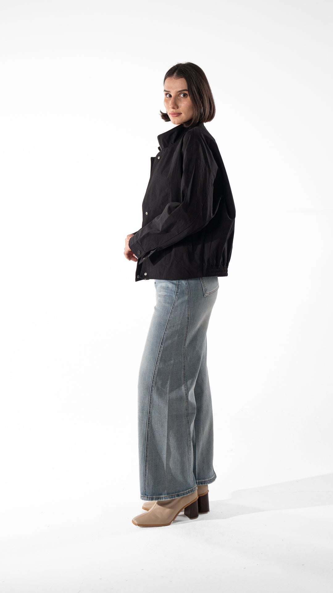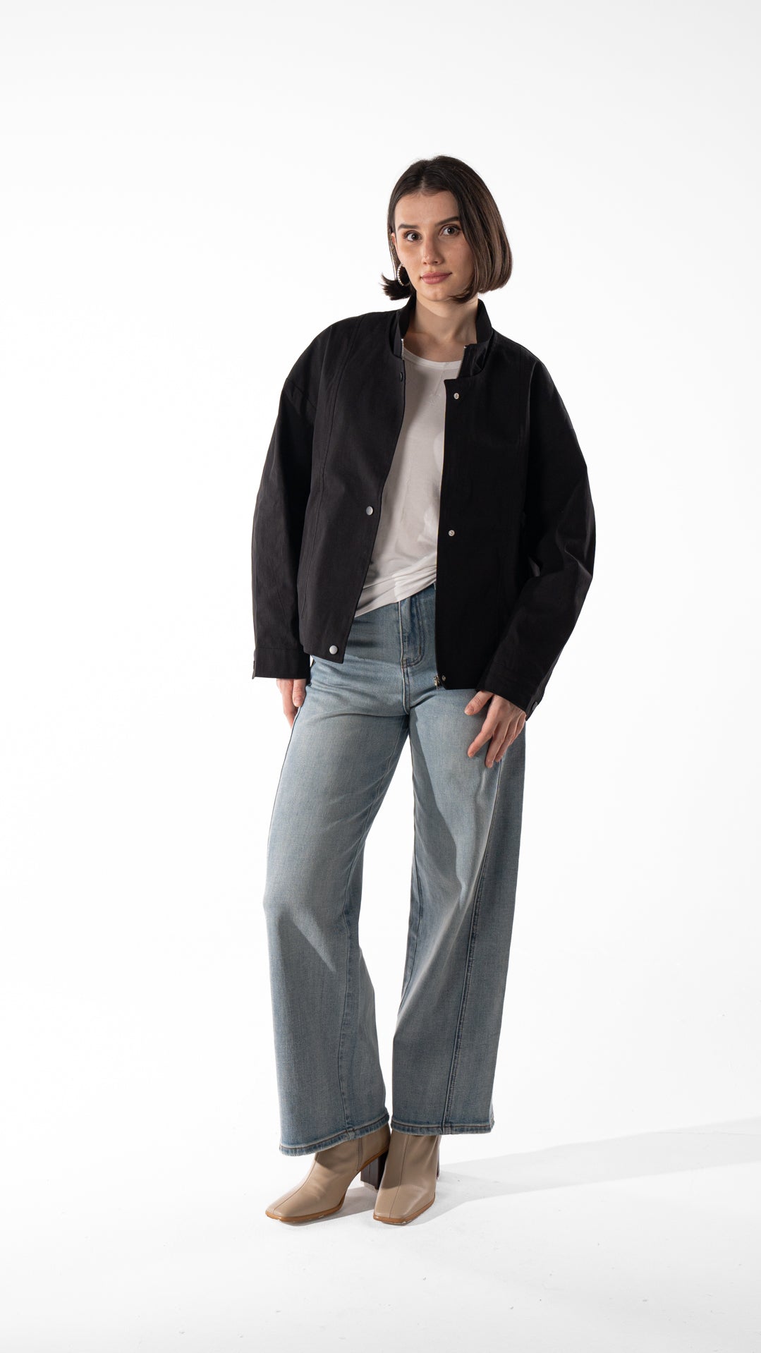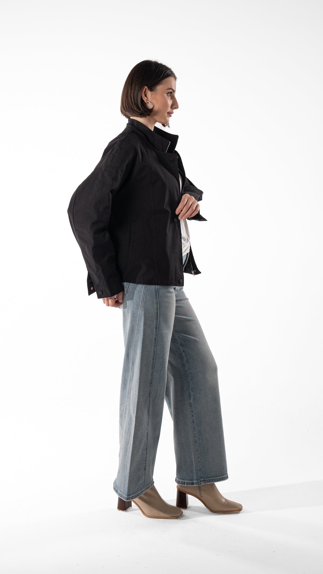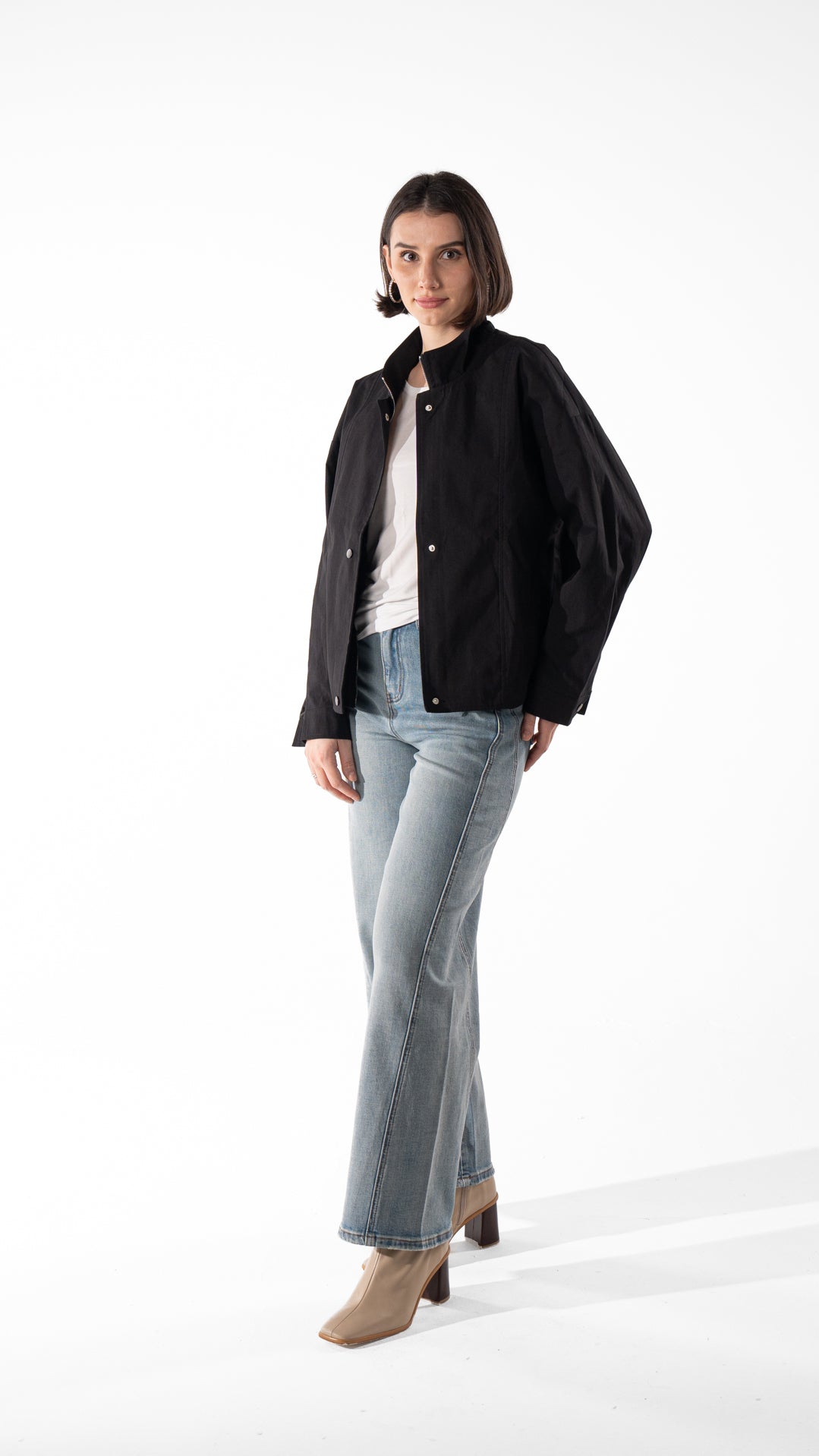 Lightweight cotton jacket with a stand collar and snap-button front. Relaxed fit and easy layering for cooler days.